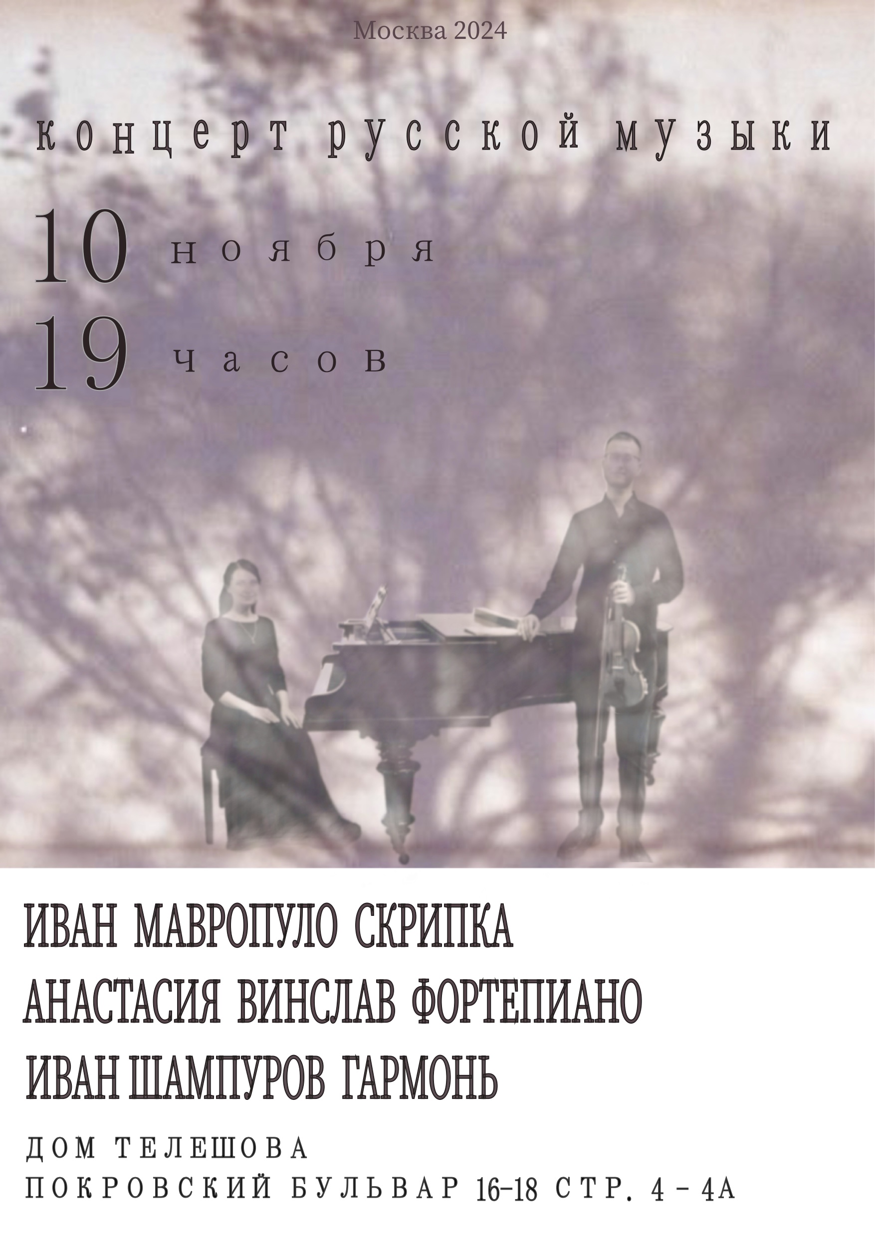 В программе дуэт лауреатов международных конкурсов, прекрасных музыкантов Ивана Мавропуло и Анастасии Винслав, которые исполнят для Вас произведения М. Глинки, А. Глазунова, А. Хачатуряна, Д. Шостаковича, Р. Глиэра, И. Стравинского и С. Рахманинова. Зритель сможет насладиться многогранностью и разнообразием музыки, берущей начало в народной традиции, которая в разной степени влияла на каждого композитора, соединяясь с самобытным взглядом и музыкальным языком каждого из них.