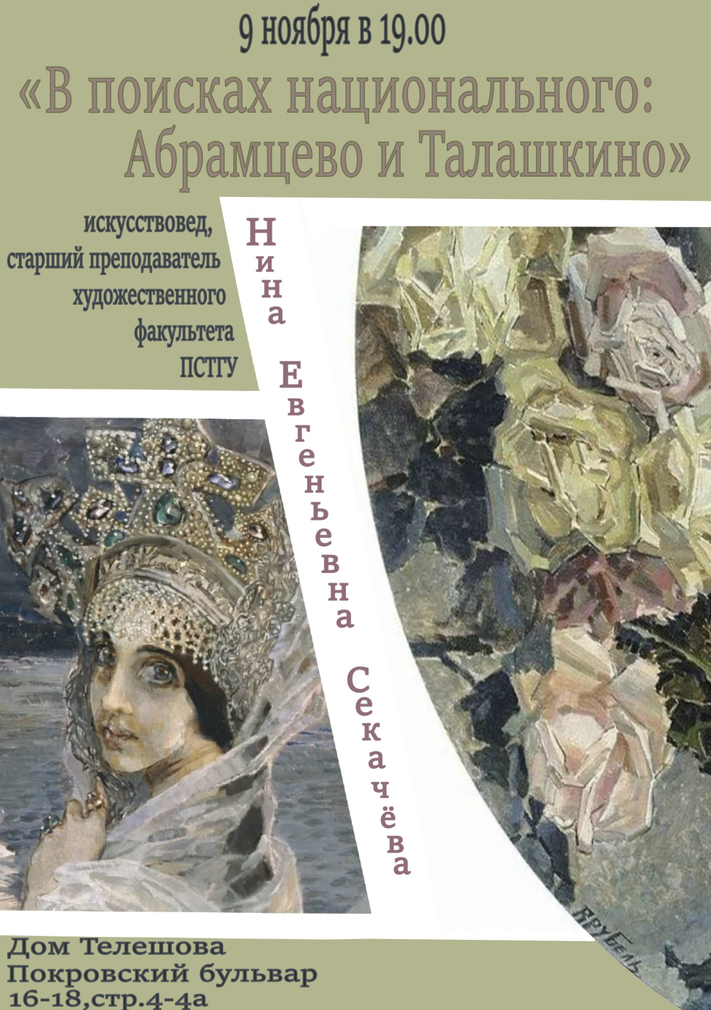 Тонкое понимание сакральной глубины и своеобразия русского изобразительного искусства отличительная черта неповторимого стиля преподавателя и искусствоведа Нины Евгеньевны Секачёвой. Ее яркие и выразительные лекции захватывают и увлекают. Цикл встреч, подготовленный для творческого объединения «Полукруг», начнется с периода конца 19 начала 20 века в русской культуре. Времени поиска и возрождения национального своеобразия в стилизации и интерпретации народных промыслов и декоративно-прикладного искусства. Речь пойдет о двух важных центрах культуры Серебряного века имениях Абрамцево С.И. Мамонтова и Талашкино княгини М.К.Тенишевой, объединивший самых ярких художников своего времени и давших жизнь неорусскому стилю в разных видах искусства.